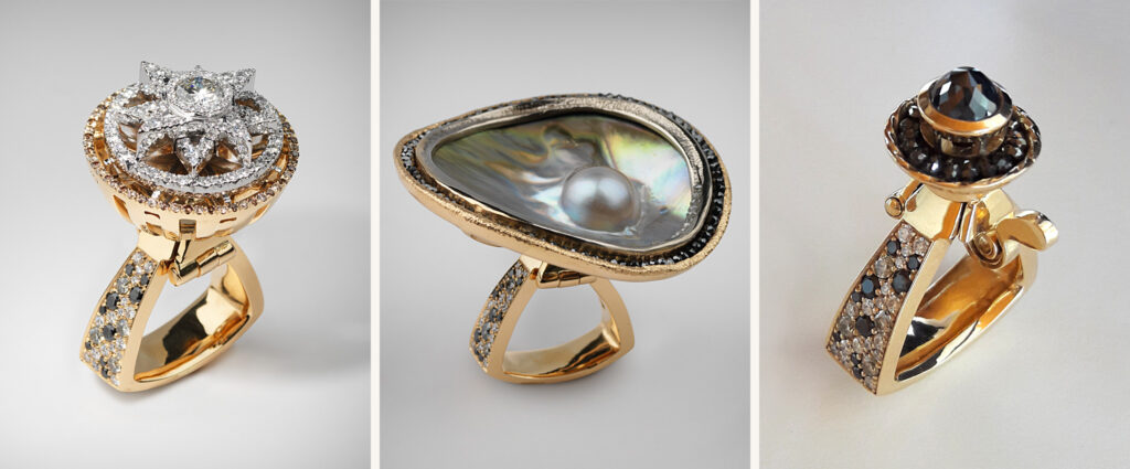Med dessa ringar vill jag få betraktaren att känna den mystik som orienten skapar, dess överdåd med mängder av stenar och bombastiska former där snäckans fattning är mjukt strömlinjeformad likt Saharas sanddynor. Där bäraren av ringen kan förändra och byta modell fritt efter stundens ingivelse och betydelse likt en kameleont.