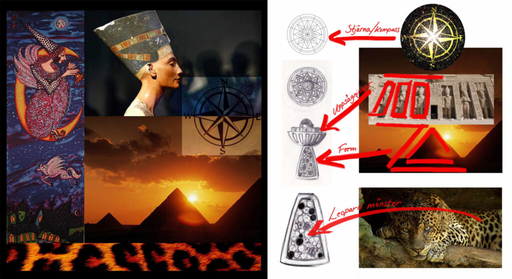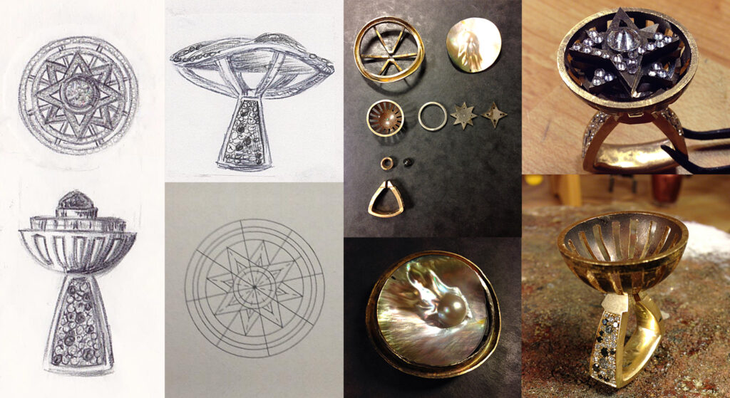 Med dessa ringar vill jag få betraktaren att känna den mystik som orienten skapar, dess överdåd med mängder av ädelstenar och bombastiska former där snäckans fattning är mjukt strömlinjeformad likt Saharas sanddynor. Där bäraren av ringen kan förändra och byta modell fritt efter stundens ingivelse och betydelse likt en kameleont.