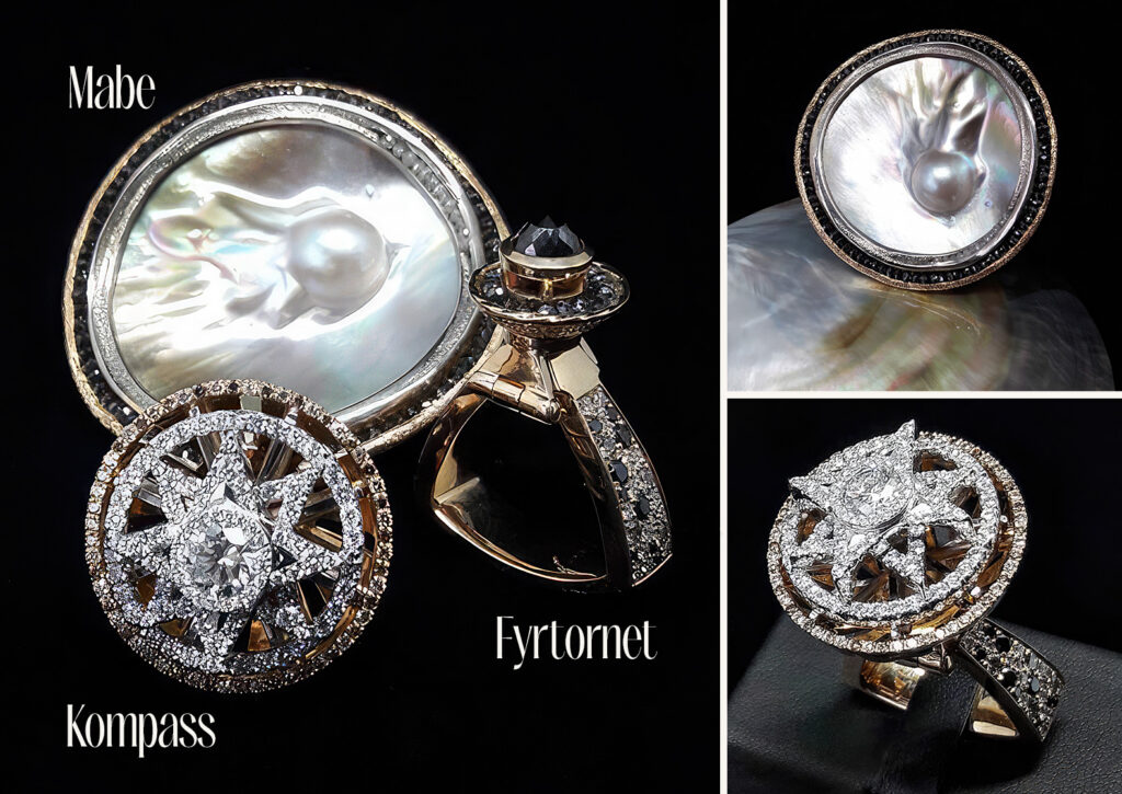 Allt detta har jag lagt in i mina verk. Leopardmönstrad skena med diamanter i färg, kompassfattning med diamanter som liknar flera stjärnor och pärlan i snäckan med svarta diamanter. Juvelerna är tillverkade i rödguld och vitguld.