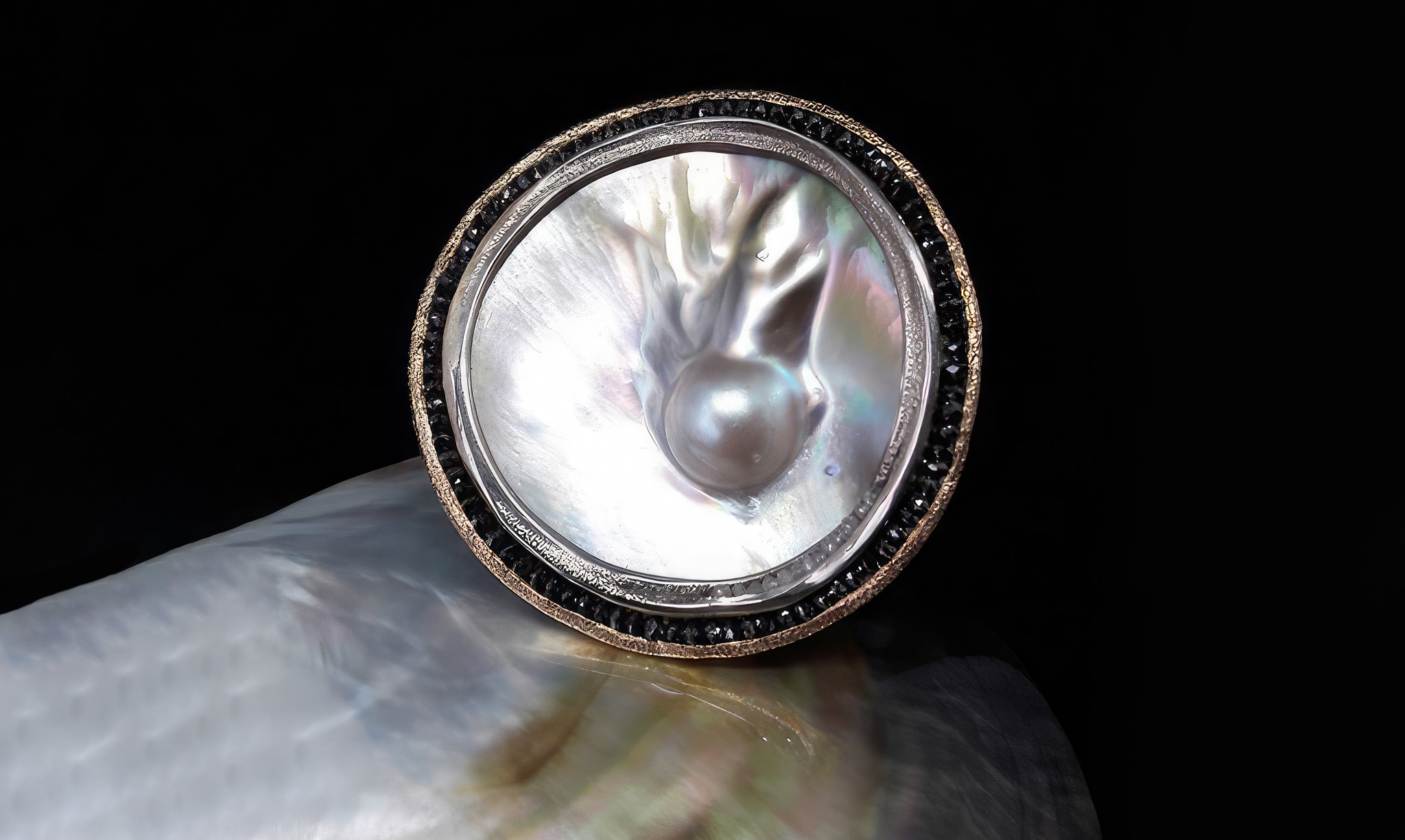- En stor mabésnäcka infattad i vitguldsarg med en ytterkant och sarg i rödguld innehållande svarta rådiamanter som är kanalfattade.